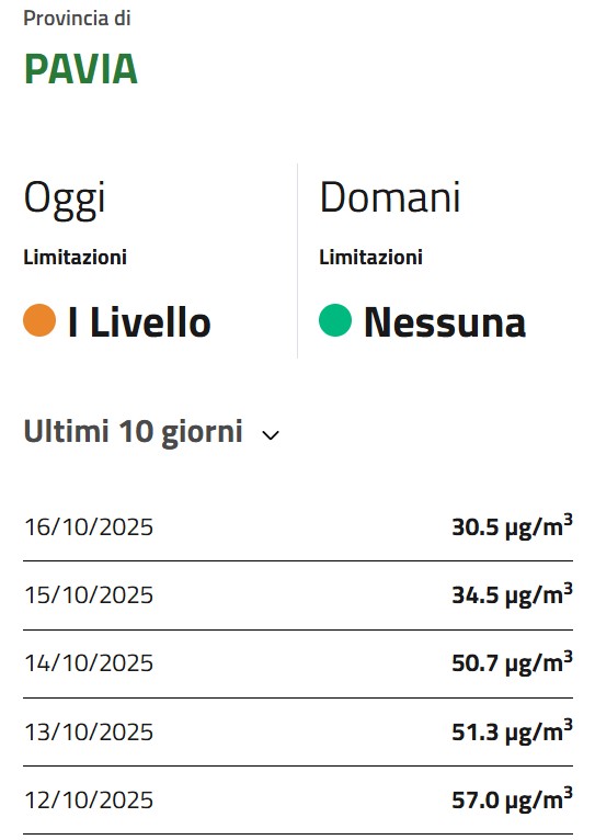 Dopo giorni di restrizioni, la provincia di Pavia potrà tirare un sospiro di sollievo. I dati più recenti di ARPA Lombardia mostrano infatti che, per il secondo giorno consecutivo, le concentrazioni di PM10 sono tornate al di sotto della soglia di 50 µg/m³.