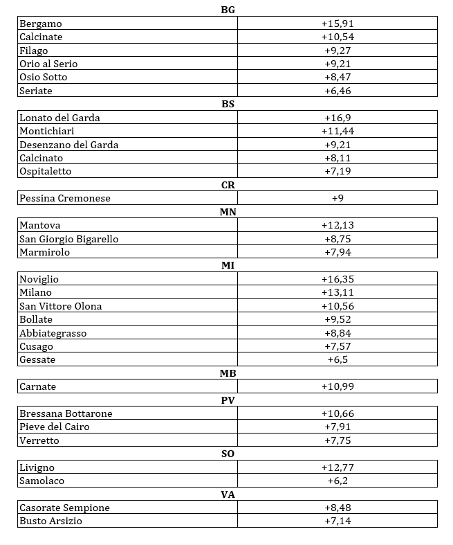 I 30 comuni lombardi ‘mangiasuolo’ nel 2024 (dati in ettari, Ha, variazione 2023-2024)