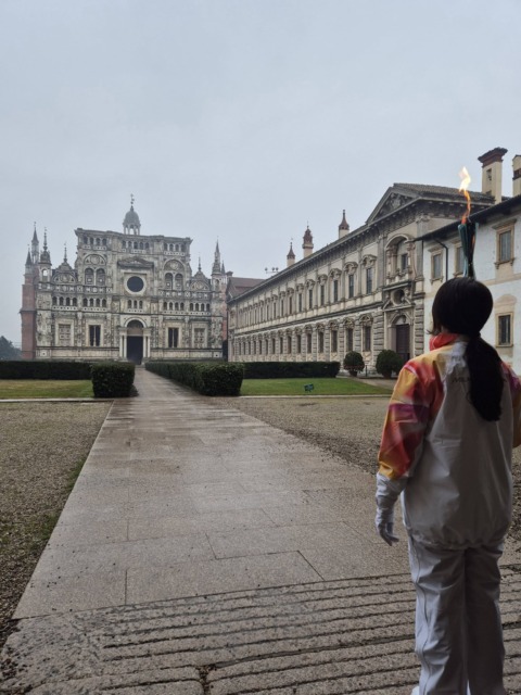La fiamma olimpica alla Certosa di Pavia (foto comune Certosa di Pavia)