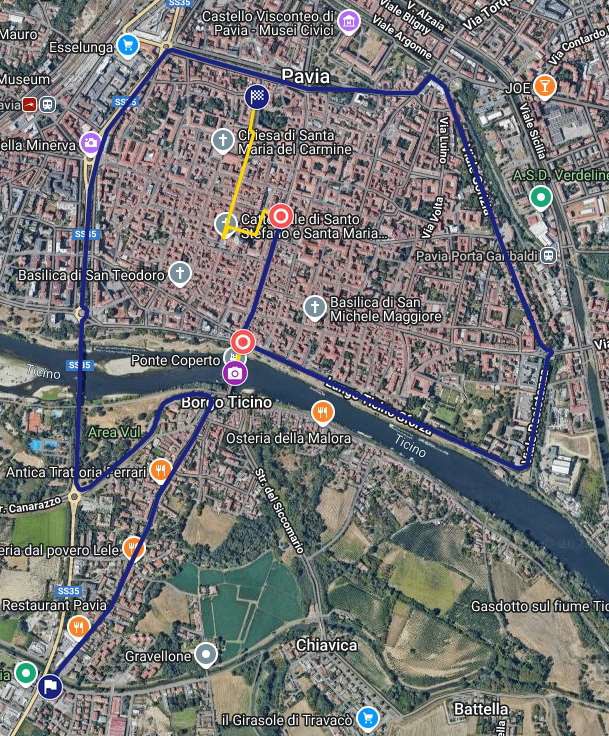Via Bramante (entrata nel territorio comunale); Via dei Mille; Piazzale Ferruccio Ghinaglia; Via XXV Aprile; Via Giuseppe Giulietti; Ponte della Libertà; Viale Libertà; Piazzale Minerva; Viale Cesare Battisti; Piazza Dante Alighieri; Viale Giacomo Matteotti; Piazza Castello; Via santa margherita alle Pertiche; Corso Famiglia Cairoli; Piazza Emanuele Filiberto Duca d’Aosta; Viale Gorizia; Piazzale Porta Garibaldi; Viale Resistenza; Viale Lungoticino Sforza; Piazzale Ponte Ticino; Ponte Coperto (stop per shooting fotografico); Piazzale Ponte Ticino; Corso Strada Nuova; Corso Camillo Benso Conte di Cavour; Piazza della Vittoria; Via Giovanni Antonio Omodeo; Via Jacopo Bossolaro; Via XX Settembre; Piazza Francesco Petrarca (arrivo).