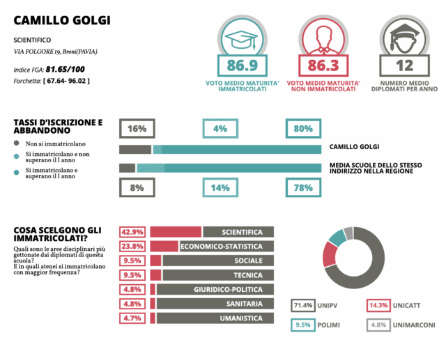 Nel caso di Pavia e provincia, l’istituto che presenta il valore più alto – e che quindi risulta quello che viene portato a termine in maniera più continuativa – è il liceo scientifico Camillo Golgi di Broni con una percentuale di 82,8% di diplomati in regola. Secondo la ricerca, è qui che il percorso scolastico appare meno accidentato e dove il numero di studenti che completano i cinque anni nei tempi previsti risulta più elevato rispetto agli altri istituti del territorio.