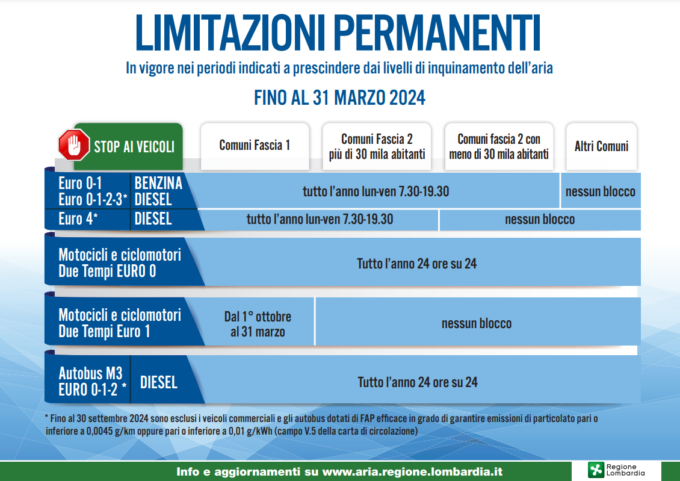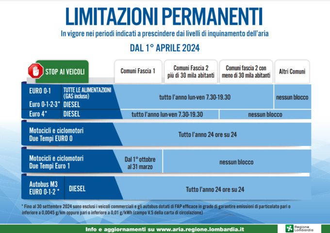 Proprio come già accade in alcune aree del capoluogo Milano, dallo scorso 1° ottobre 2023 è stato deciso di estendere a tutto l’anno la limitazione dei veicoli Euro 4 diesel nei Comuni di Fascia 1 e nei Comuni con più di 30.000 abitanti di Fascia 2.