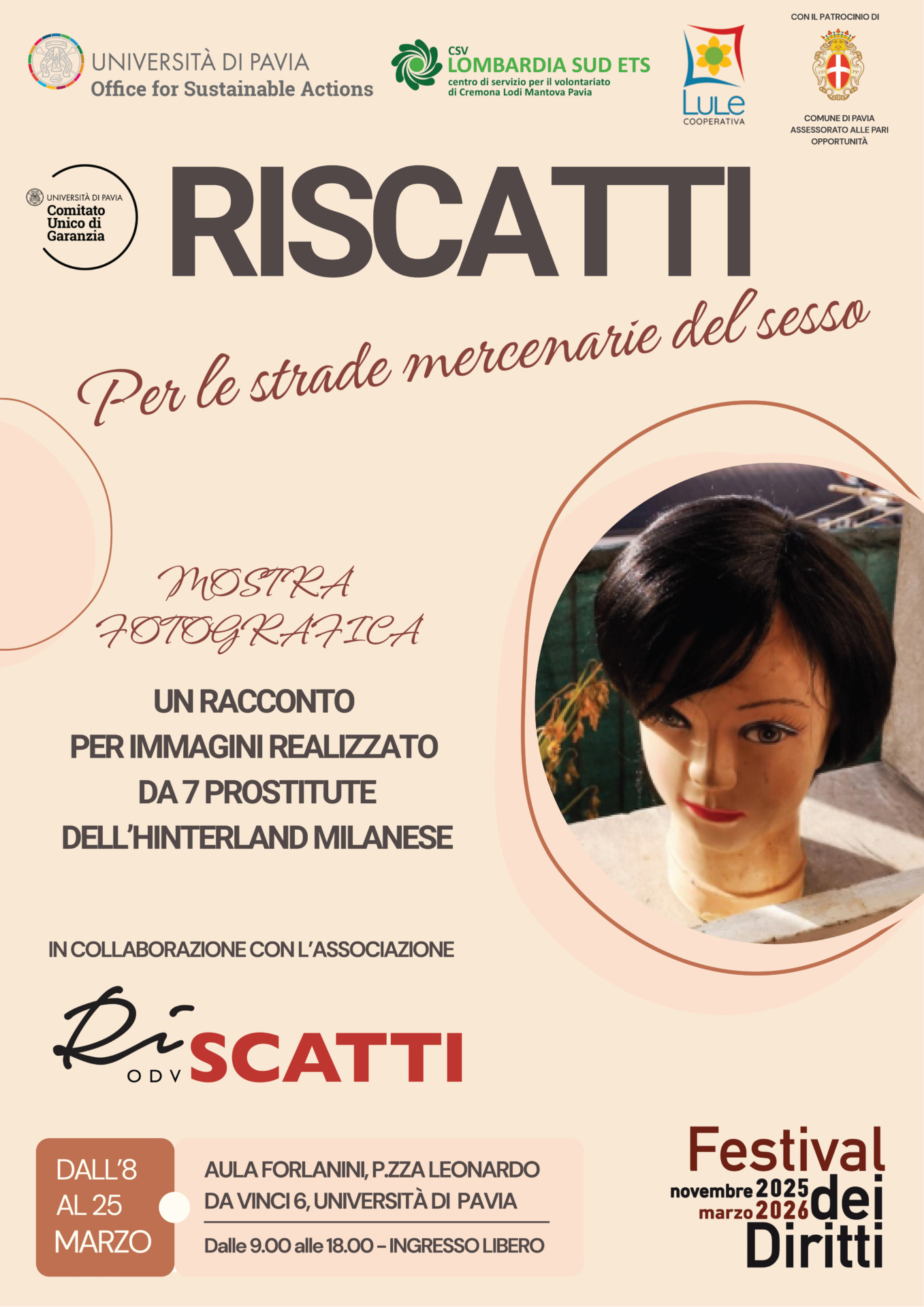 Fino al 25 marzo 2026 l’Università di Pavia ospita la mostra fotografica “Ri-scatti. Per le strade mercenarie del sesso”, allestita nell’Aula Forlanini di Piazza Leonardo da Vinci. L’iniziativa è promossa dall’Office for Sustainable Actions (OSA) in collaborazione con il CUG dell’ateneo, con la cooperativa Lule Onlus e con il patrocinio del Comune di Pavia – Assessorato alle Pari Opportunità.
