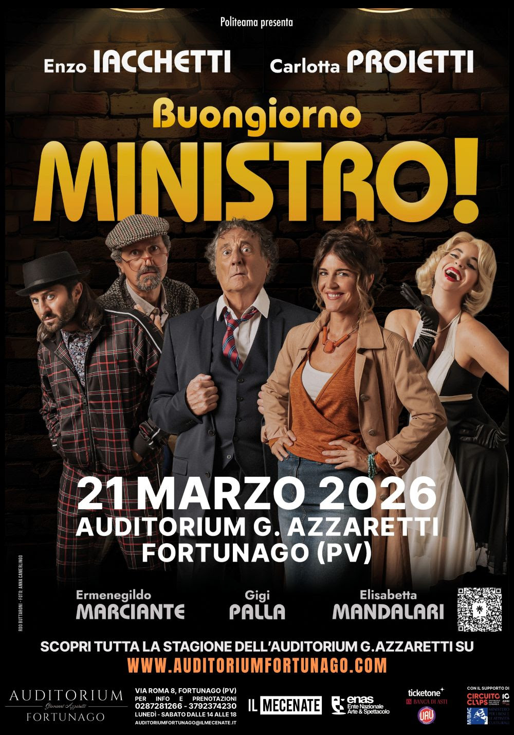 Sabato 21 marzo 2026 a Fortunago debutta in prima assoluta “Buongiorno, Ministro!”, commedia brillante con Enzo Iacchetti e Carlotta Proietti. Lo spettacolo mescola satira politica e colpi di scena per raccontare, tra risate e riflessione, l’incontro tra un politico corrotto e una travolgente venditrice.