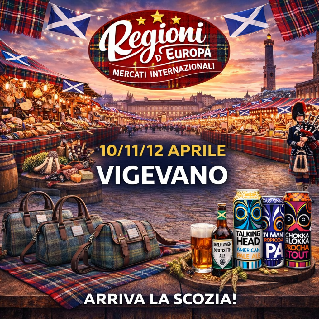 Dal 10 al 12 aprile 2026 Vigevano ospita la manifestazione Regioni d’Europa con oltre 50 espositori internazionali, tra cui una delegazione scozzese con artigianato e specialità tipiche. Un evento gratuito che offre cultura, cibo e tradizioni europee nel centro storico.