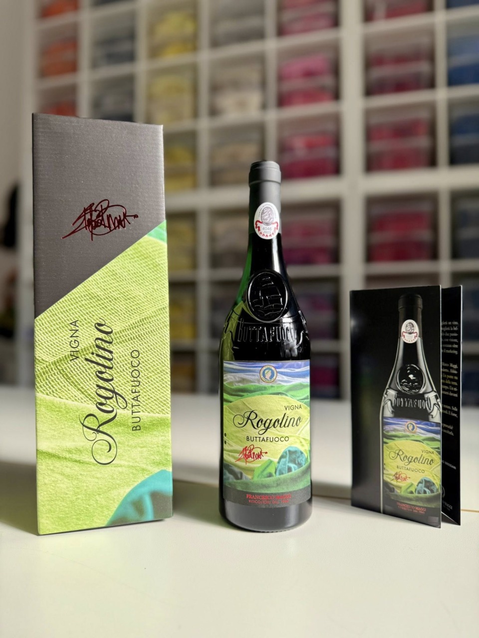 Il progetto nasce dall’incontro tra la tradizione vinicola dell’Oltrepò Pavese e la creatività contemporanea. Le stoffe che vestono la bottiglia diventano simbolo tangibile di un’idea che unisce arte e vino, raccontando la storia della Vigna Rogolino attraverso il colore, la materia e il gesto artistico.
