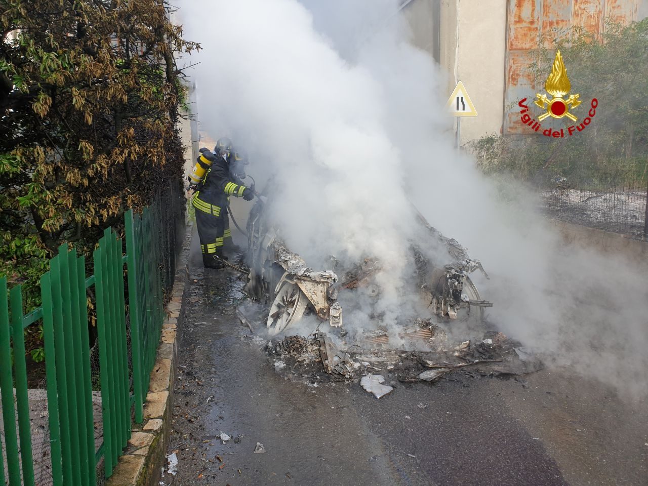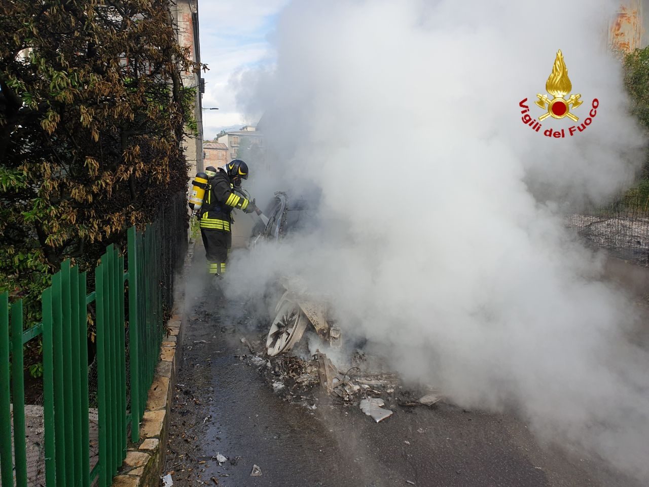 Stradella: auto distrutta dopo aver preso fuoco. E’ successo in via San Lodovico. Intervengono i Vigili del Fuoco.