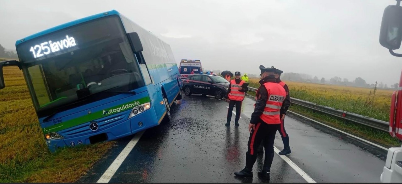E’ successo intorno alle 7.30 di oggi, lunedì 22 settembre 2025. Stando alle prime ricostruzioni dei Carabinieri, il conducente di un autobus della società “Autoguidovie”, in servizio sulla tratta Pieve del Cairo – Mortara, con a bordo circa 20 ragazzi di età compresa tra i 14 e i 17 anni, giunto a Cergnago, nell’accostarsi al margine destro della carreggiata, probabilmente a causa del fondo stradale bagnato, ha perso il controllo del mezzo, che è finito fuori strada e si è inclinato lateralmente verso un campo agricolo adiacente.
