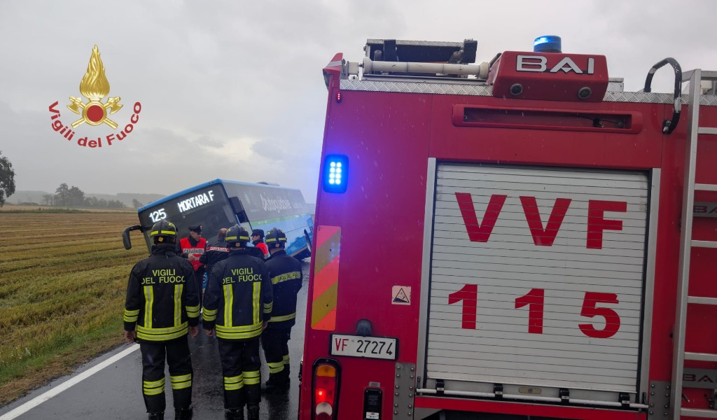 Un autobus di linea con 21 passeggeri a bordo è uscito di strada lungo la SS211 a Cergnago: strada temporaneamente chiusa in entrambe le direzioni per consentire i soccorsi e i rilievi.