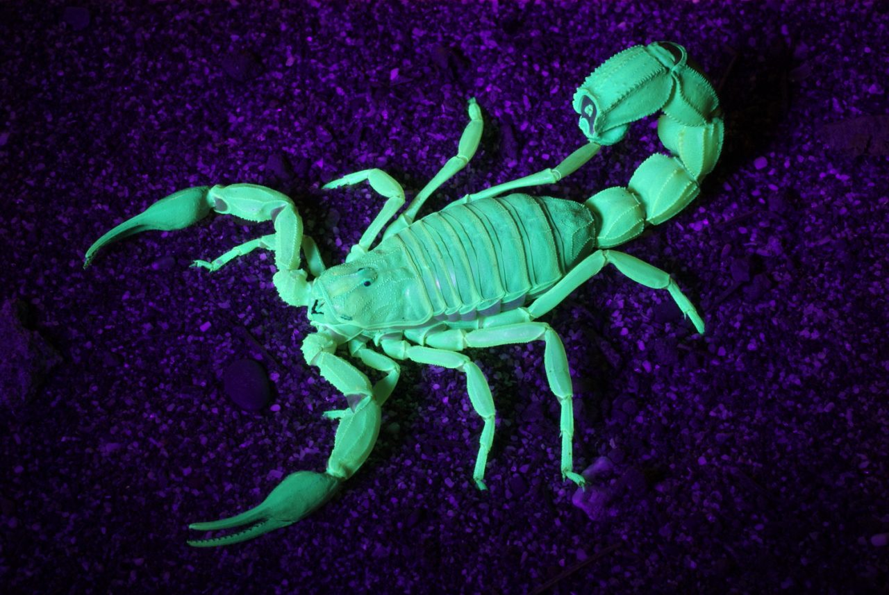 Desert scorpion, Androctonus australis, looking fluorescent to UV light in the dark. They are the only Arthropods with this capability, developed by their ancestors to screen themselves from strong UV radiation of the Paleozoic era