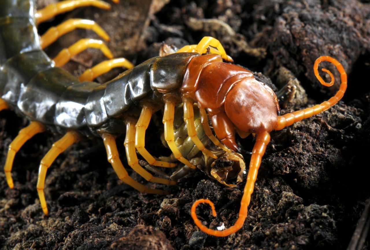 Texas centipede, Scolopendra heros, eating grasshopper, United States