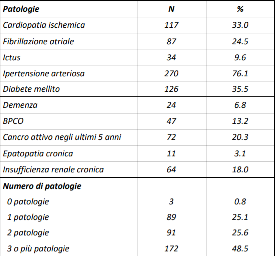La tabella 1 presenta le più comuni patologie croniche pre-esistenti (diagnosticate prima di contrarre l’infezione) nei pazienti deceduti. Questo dato è stato ottenuto in 355/2003 deceduti (17,7% del campione complessivo). Il numero medio di patologie osservate in questa popolazione è di 2.7 (mediana 2, Deviazione Standard 1.6). Complessivamente, 3 pazienti (0,8% del campione) presentavano 0 patologie, 8 9 (25,1%) presentavano 1 patologia, 91 presentavano 2 patologie (25.6%) e 172 (48,5%) presentavano 3 o più patologie.