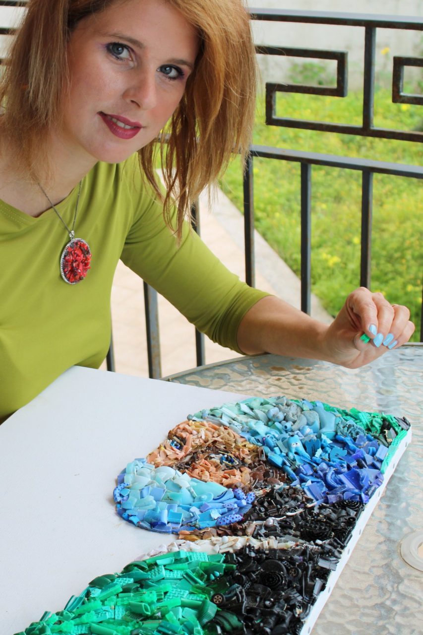 Come ogni opera di Lady Be, famosa per i suoi “ritratti di plastica” è realizzata in suo stile e con la sua speciale tecnica, un mosaico fatto di tappi di plastica, giocattoli, penne, bottoni, bigiotteria e oggetti di uso comune che tutti conosciamo.