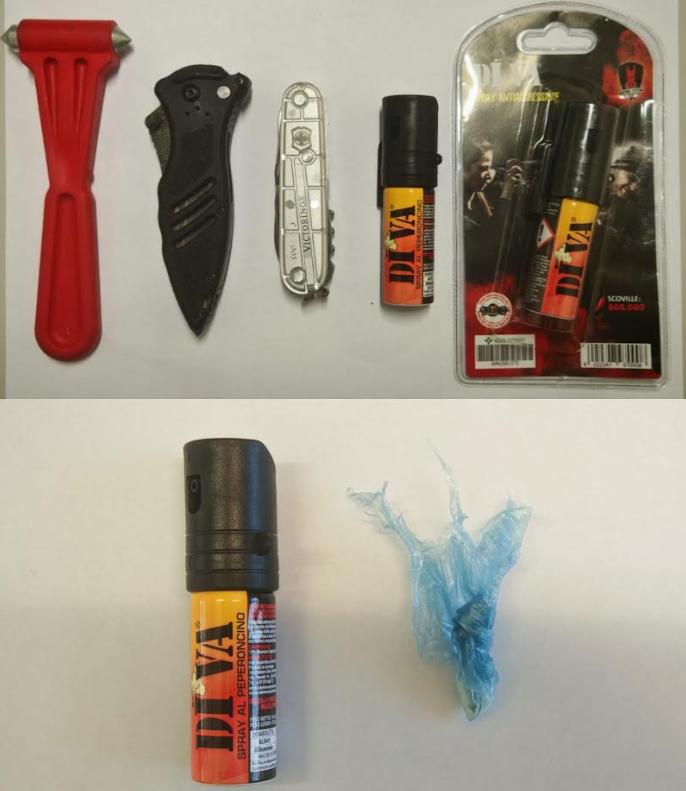 La 43enne, invece, aveva con sé un vero e proprio “kit” di oggetti atti ad offendere: due ulteriori bombolette di spray al peperoncino ancora sigillate, un coltello a serramanico con una lama di circa 7 centimetri, un coltellino svizzero e un martelletto frangivetro.