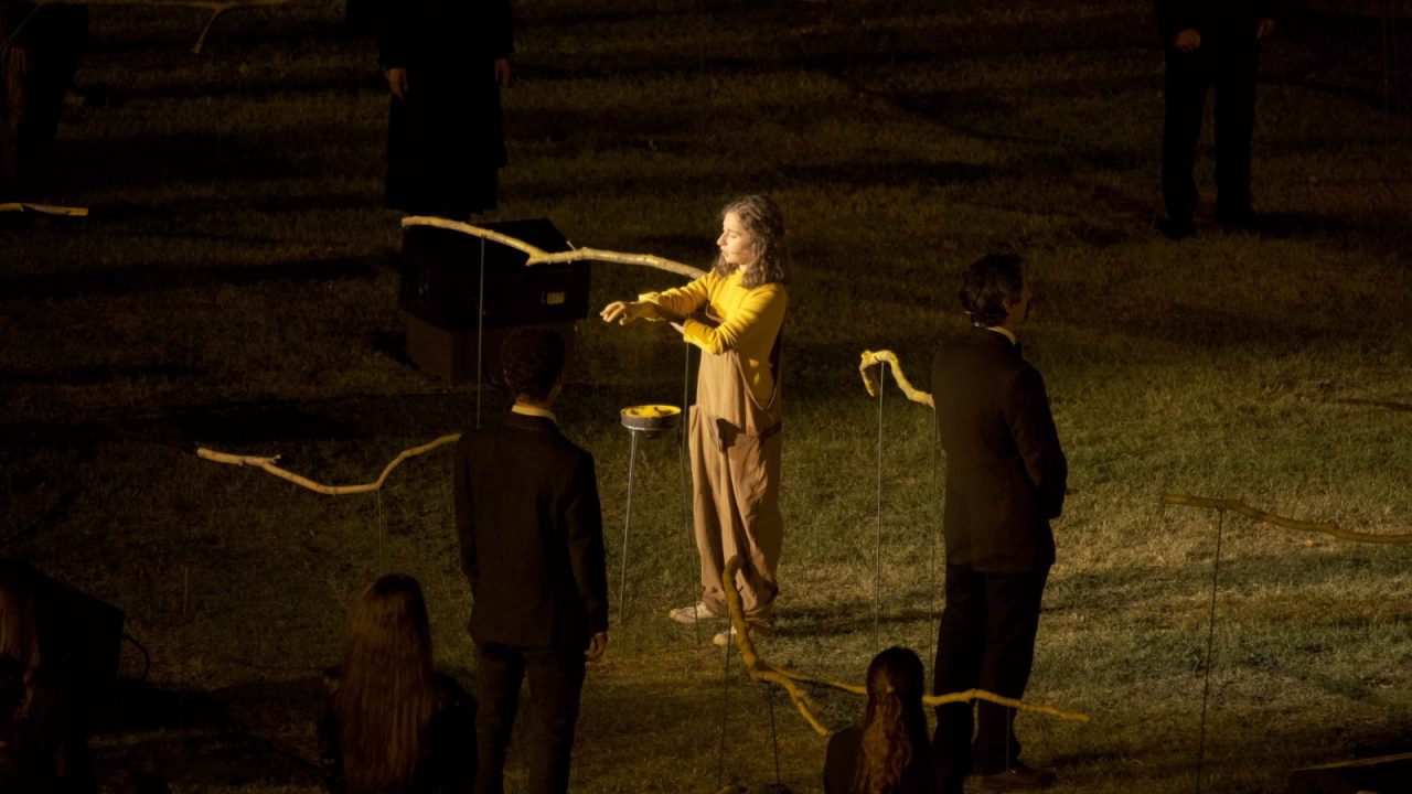 In un’atmosfera sacrale, resa intensa e toccante anche grazie al coro che risuonava nelle volte del portico del Castello, i trampolieri muniti di torce accese hanno accolto il pubblico, che si è dapprima disposto a cerchio e poi, su invito dei danzatori, è stato accolto nel “polmone”, al cui centro una giovane attrice ha recitato il testo di Nove Marzo Duemilaventi.