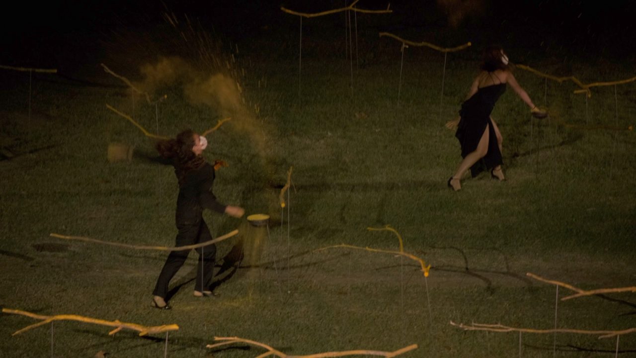 Dal gruppo degli artisti, inizialmente schierati e distanziati fuori dal cerchio, sono usciti prima i danzatori, che con le loro performance hanno disegnato nell’aria getti e folate di polvere ocra.