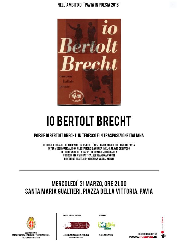 Due eventi – organizzati dal Settore Cultura, Istruzione e Politiche Giovanili del Comune di Pavia in collaborazione con il Gruppo Utenti Lettori Bonetta, l’Associazione Alunni ed Ex Alunni Collegio Griziotti, Esquilibrio Teatro e gli allievi del corso di tedesco dell’APS-Pavia Nord e dell’UNI 3 di Pavia coordinati dalla docente Alessandra Crotti – in programma mercoledì 21 e giovedì 22 marzo proporranno come filo conduttore l’espressione poetica, declinata in diverse forme, e saranno dedicati alle figure di Ada Negri e di Bertolt Brecht. Si inzia mercoledì 21 marzo, alle ore 21.00, a Santa Maria Gualtieri (Piazza della Vittoria), con l’evento Io Bertolt Brecht, un recital con musica e poesie in tedesco e italiano organizzato in collaborazione con l’Associazione Alunni ed Ex Alunni Collegio Griziotti e a cura di Esquilibrio Teatro.