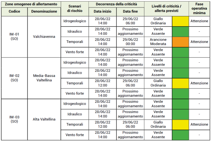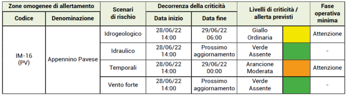Per la giornata di oggi, martedì 28 giugno 2022, sono attese spiccate condizioni di instabilità su tutta la regione. Nuovi fenomeni sono attesi nel corso della seconda parte della giornata con precipitazioni diffuse, localmente abbondanti, a prevalente carattere di rovescio o temporale. Moderata probabilità di fenomeni intensi estesa anche alle pianure, con fenomeni di locale grandine fino a dimensioni medio-grandi. Sono inoltre attese forti raffiche di vento (superiori anche a 90 km/h) in accompagnamento ai temporali più intensi. Si confermano anche possibili locali picchi di oltre 50 mm nelle 6 ore e fino a 80-100 mm nelle 12 ore, in particolare sulle zone Meridionali e sulle zone Centro-Orientali. Su tali zone fenomeni più probabili dal tardo pomeriggio/sera, persistenti anche sino alle prime ore di domani.