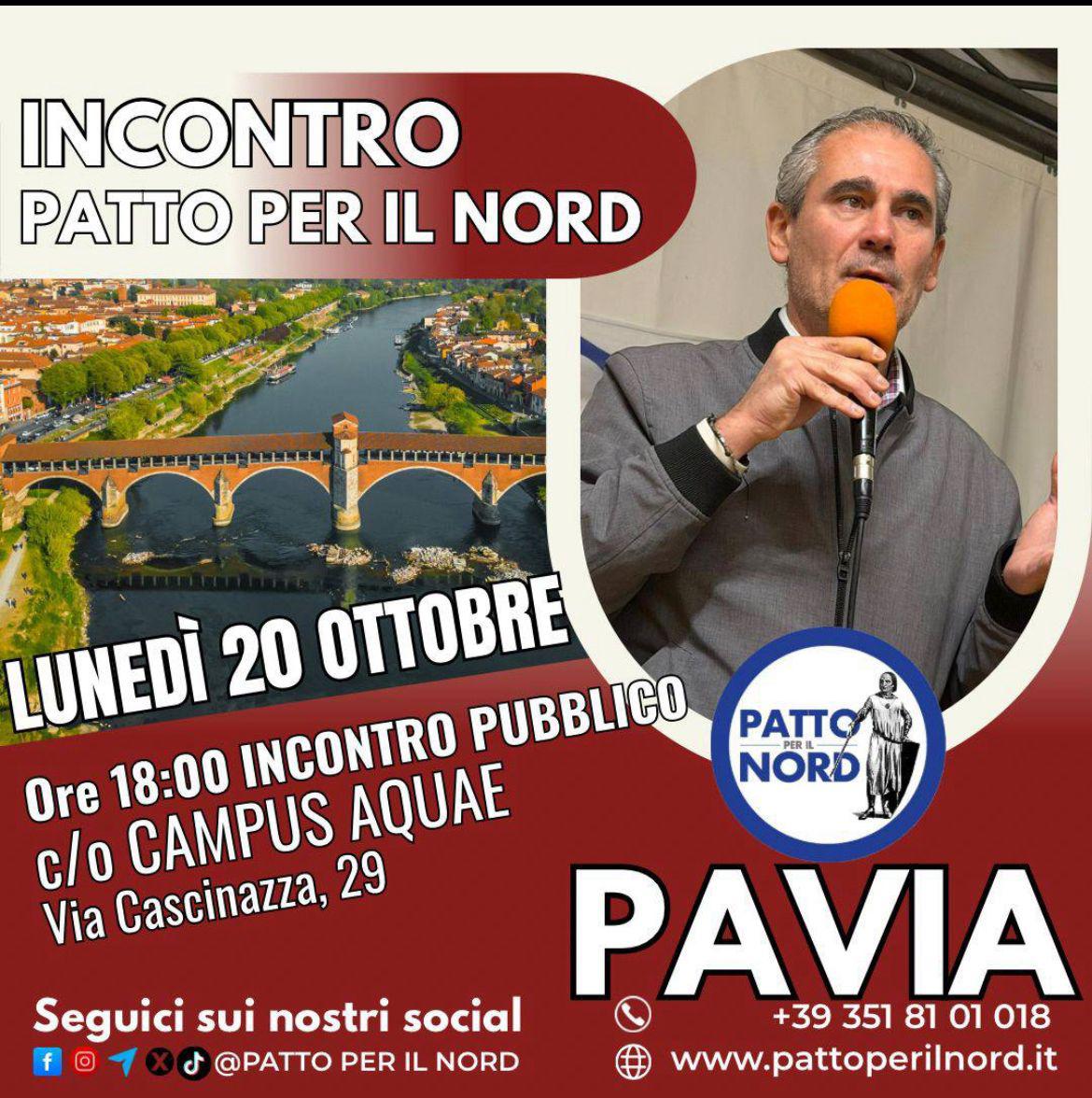 Lunedì 20 ottobre 2025 al Campus Aquae di Pavia si terrà il primo incontro pubblico provinciale di Patto per il Nord, il nuovo movimento federalista guidato da Paolo Grimoldi. L’evento è organizzato da Niccolò Fraschini e Giancarlo Malvestito.