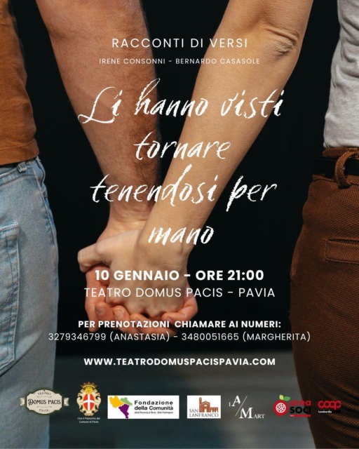 Sabato 10 gennaio alle 21, al Teatro Domus Pacis di Pavia va in scena “Li hanno visti tornare tenendosi per mano”, spettacolo della Compagnia Racconti Di Versi. Bernardo Casasole e Irene Consonni raccontano la storia di Anna e Marco attraverso un percorso che unisce prosa, poetry slam e stand-up comedy, con toni poetici e comici. Lo spettacolo esplora incontri casuali, sogni e mondi opposti che trovano un punto d’incontro, offrendo una riflessione intensa sull’amore e sulla vita quotidiana. L’entrata è a offerta libera; prenotazioni ai numeri 3279346799 (Anastasia) e 3480051665 (Margherita). La rassegna 2025/26 Riflettersi per capirsi è promossa da I AM ART-APS con contributi della Fondazione della Comunità della Provincia di Pavia, patrocinio del Comune e supporto di partner locali.