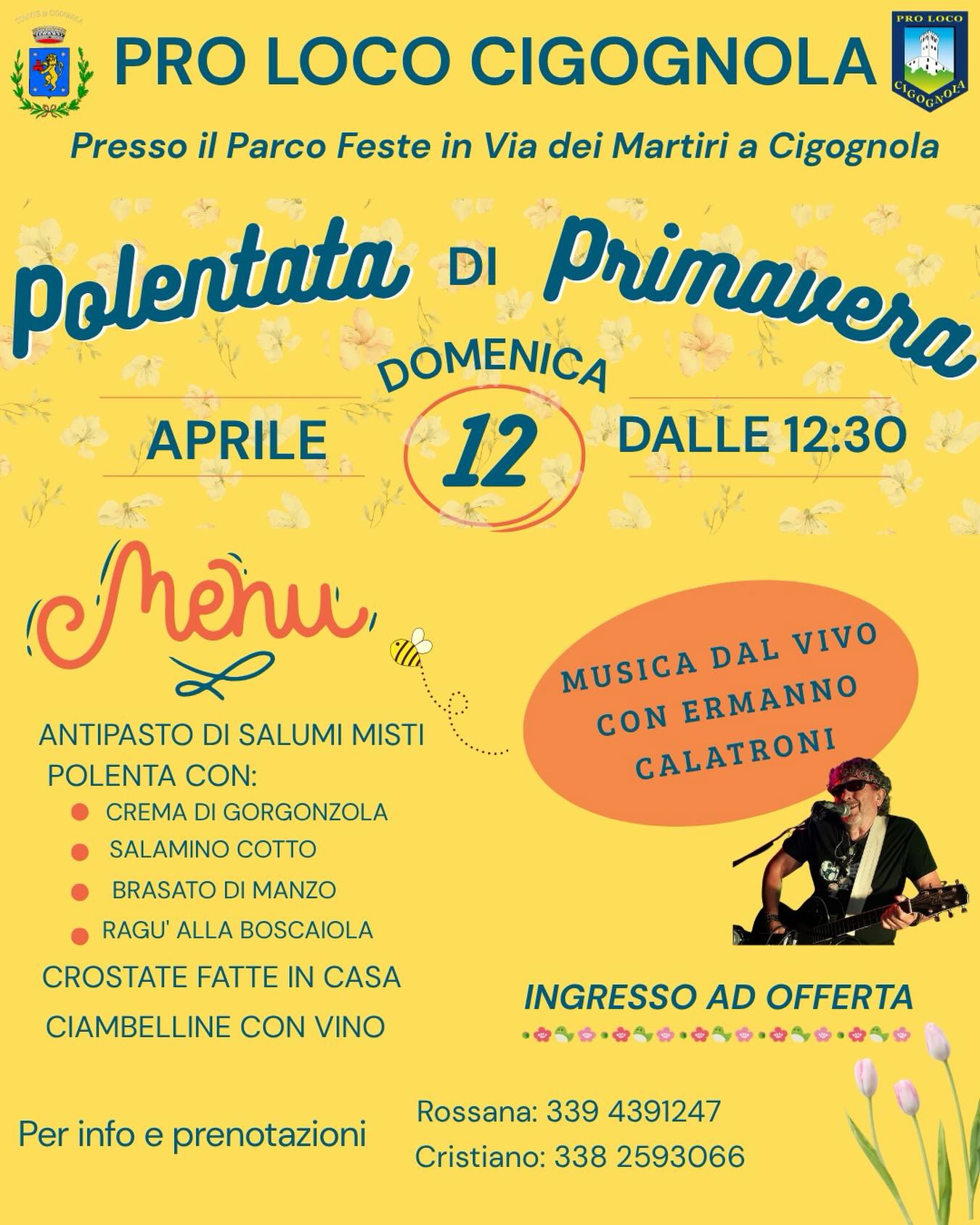 Domenica 12 aprile 2026 torna la “Polentata di Primavera” a Cigognola (PV), l’appuntamento conviviale organizzato dalla Pro Loco presso il Parco Feste di Via dei Martiri. Protagonista del pranzo sarà la polenta preparata con farina del Mulino Bruciamonti, servita con brasato, salamino e altri condimenti tipici, oltre a salumi locali e dolci fatti in casa. L’evento, animato dalla musica dal vivo di Ermanno Calatroni, celebra le tradizioni enogastronomiche dell’Oltrepò Pavese in un’atmosfera di festa aperta a tutti. Un’occasione ideale per scoprire il borgo e sostenere il territorio. Ingresso a offerta a partire dalle ore 12:30.