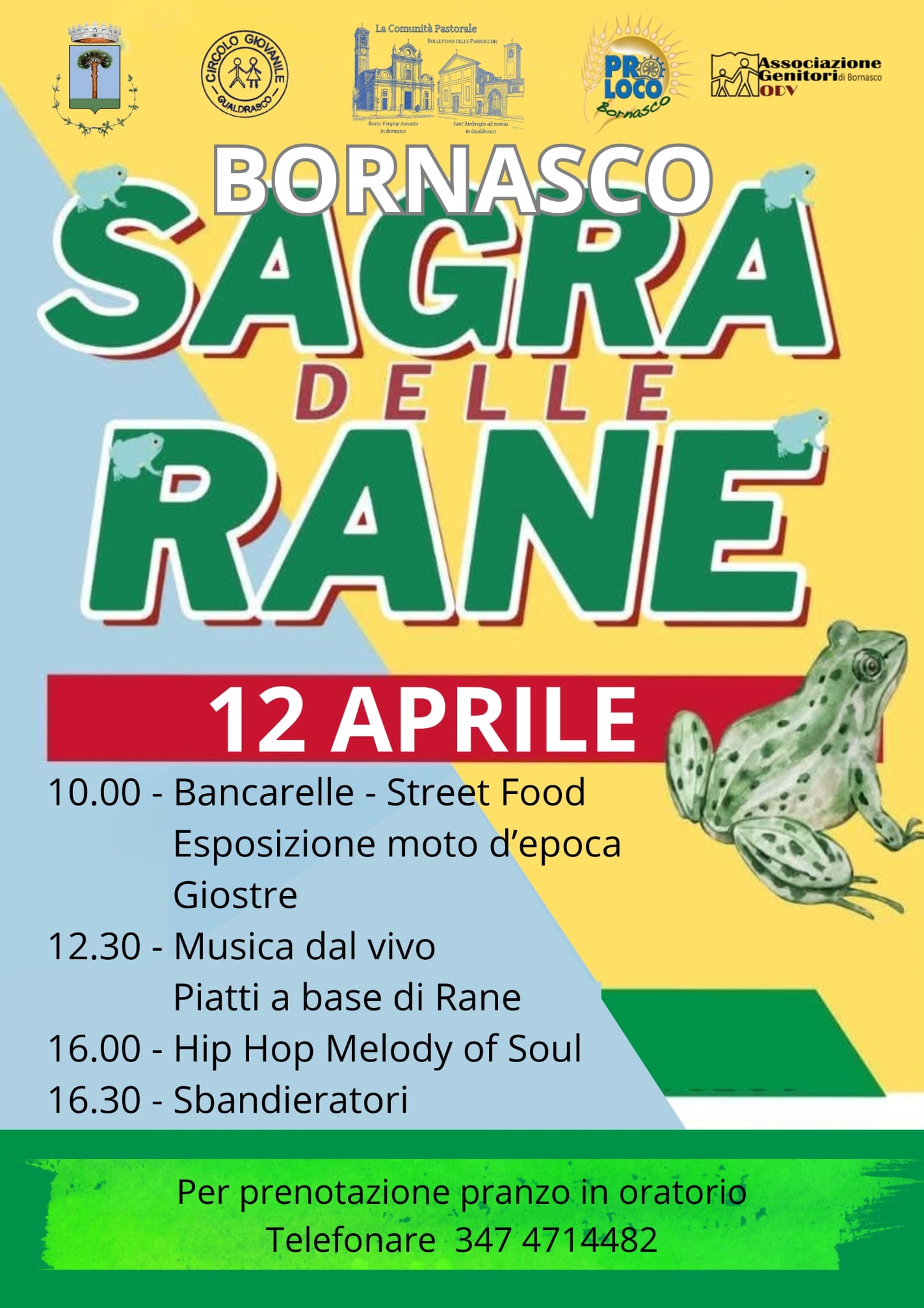 Domenica 12 aprile 2026, Bornasco rinnova la storica Sagra della Rana, tradizione che risale al 1870. Nel fine settimana successivo alla Pasqua, via Dante e via Verdi ospiteranno un evento che celebra la cultura gastronomica locale: dalle 12:30 aprirà il banco gastronomico con rane fritte e in frittata, accompagnato da musica dal vivo. Il pomeriggio sarà arricchito dalla sfilata degli sbandieratori alle 16:30. Organizzata con il supporto delle realtà locali, la festa trasforma un antico alimento povero della civiltà contadina in un’occasione di convivialità e divertimento per famiglie, turisti e appassionati di sapori autentici. Maggiori info e programma CLICCANDO QUI.