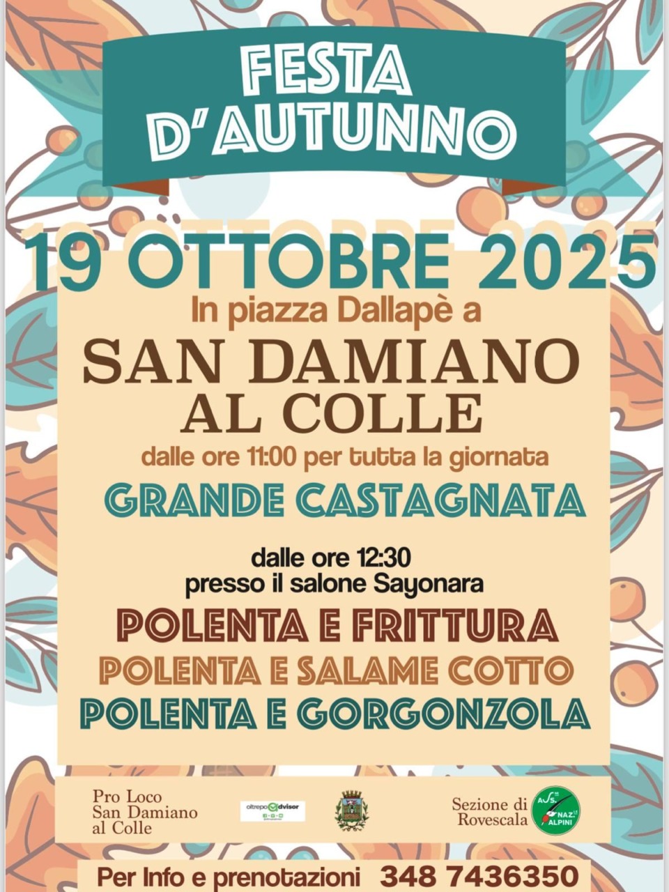 Una domenica autunnale sulle colline dell’Oltrepò Pavese in compagnia della Proloco San Damiano al Colle per gustare polenta con frittura, gorgonzola e salamino cotto e l’immancabile castagnata dalle 11 in piazza Dallapè, con la collaborazione degli amici Alpini della sezione di Rovescala. Dalle 12.30 presso il salone Sayonara potrete gustare piatti tipici di stagione accompagnati dal buon vino locale. È gradita la prenotazione al numero +39 3487436350. Maggiori info CLICCANDO QUI.