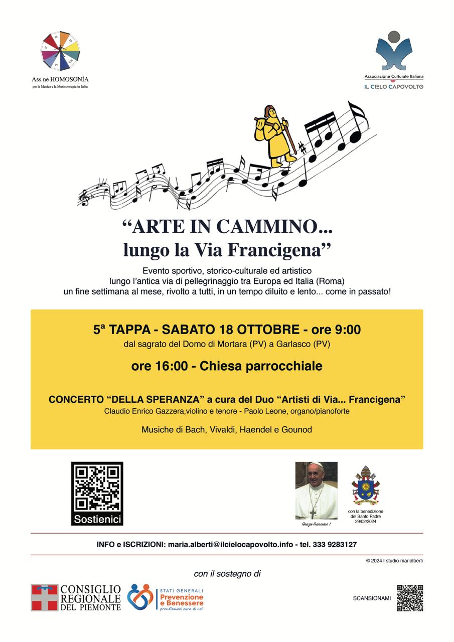 Sabato 18 ottobre alle ore 9,30/10 ripartirà dal sagrato del Duomo di Mortara il progetto ARTE IN CAMMINO…lungo la Via Francigena, organizzato dall’Associazione Homosonia di Torinp in collaborazione con Il Cielo Capovolto di Torino, che è quest’anno giunto al suo terzo anno di percorrenza. Partito infatti nel giugno del 2023 dal lago del Moncenisio (Francia) questo evento itinerante sportivo, storico-culturale ed artistico lungo la più antica via di pellegrinaggio tra l’Europa e l’Italia si svolge un fine settimana al mese con percorrenza media di 20 km a volta, rivolto a tutti (piccoli e grandi) ed in un tempo diluito e lento come in passato. Da due mesi circa siamo approdati in Lomellina e giungeremo per la nostra tappa 5 a Garlasco (PV) per l’ora di pranzo. Nel primo pomeriggio breve concertino musicale di saluto a tutti i partecipanti e presenti presso il Santuario della Bozzola, a chiusura della giornata. Info e iscrizioni: maria.alberti@ilcielocapovolto.info. Il progetto ha il sostegno di Consiglio regionale del Piemonte e da febbraio 2024 gode della benedizione particolare altresì del compianto Papa Francesco.