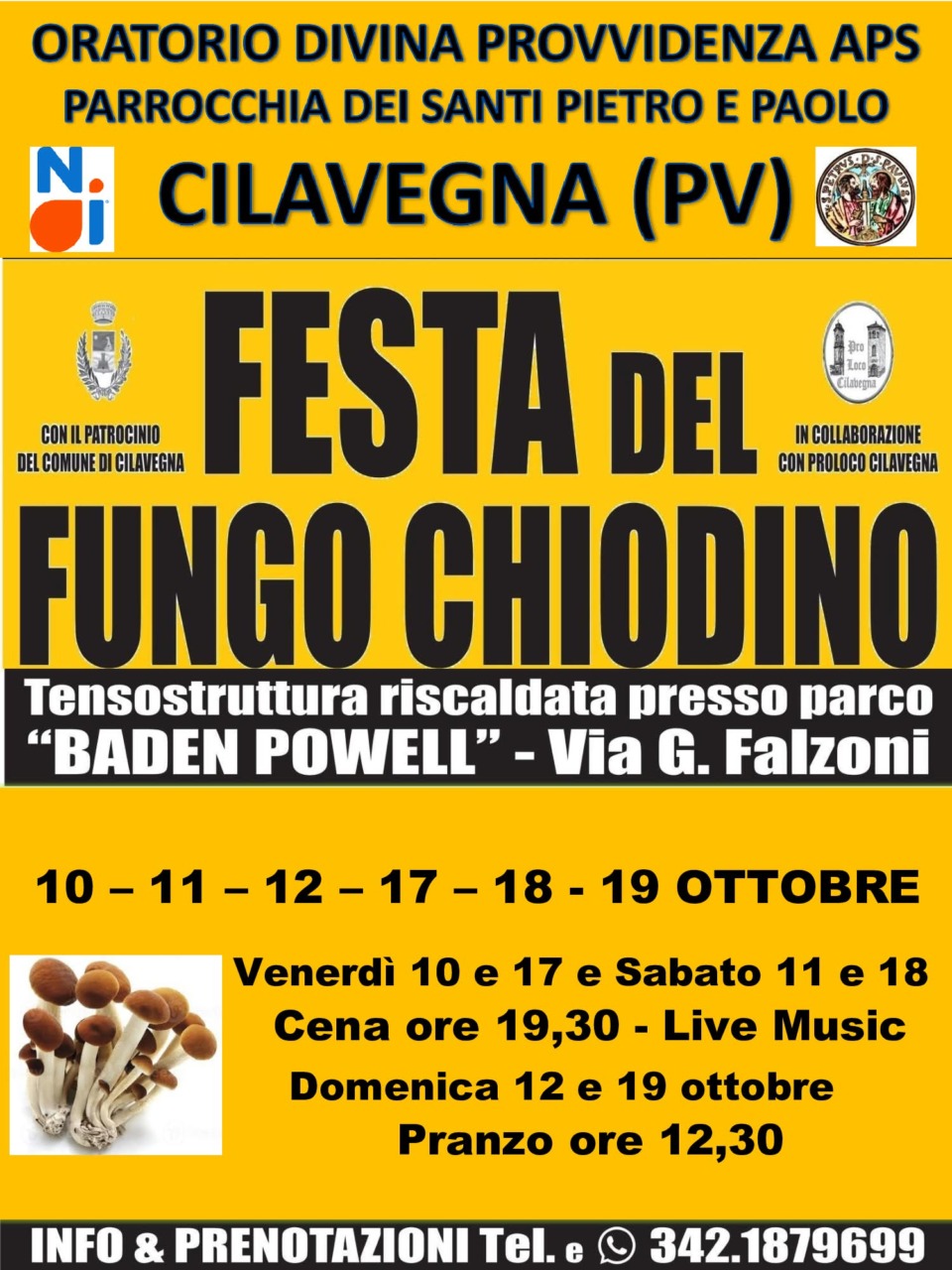 Cilavegna si prepara a vivere un weekend dedicato al fungo chiodino, un prodotto molto apprezzato in cucina per la sua versatilità. Considerato uno dei funghi più consumati al mondo, viene soprannominato “l’asparago dei funghi” perché, come gli asparagi, la parte più tenera e commestibile è l’estremità superiore. La tradizionale sagra autunnale si svolgerà anche quest’anno presso la tensostruttura riscaldata del parco Baden Powell (via G. Falzoni), organizzata dall’Oratorio Divina Provvidenza di Cilavegna, in collaborazione con la parrocchia dei Santi Pietro e Paolo e la Pro Loco di Cilavegna, con il patrocinio del Comune. Le cucine resteranno aperte alla sera nei giorni di venerdì 17 e sabato 18 ottobre a partire dalle 19:30, con intrattenimento musicale, karaoke e dj set. La domenica 19 ottobre l’apertura sarà invece prevista solo a pranzo, dalle 12:30.