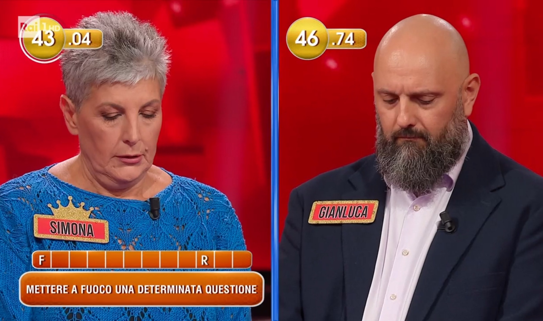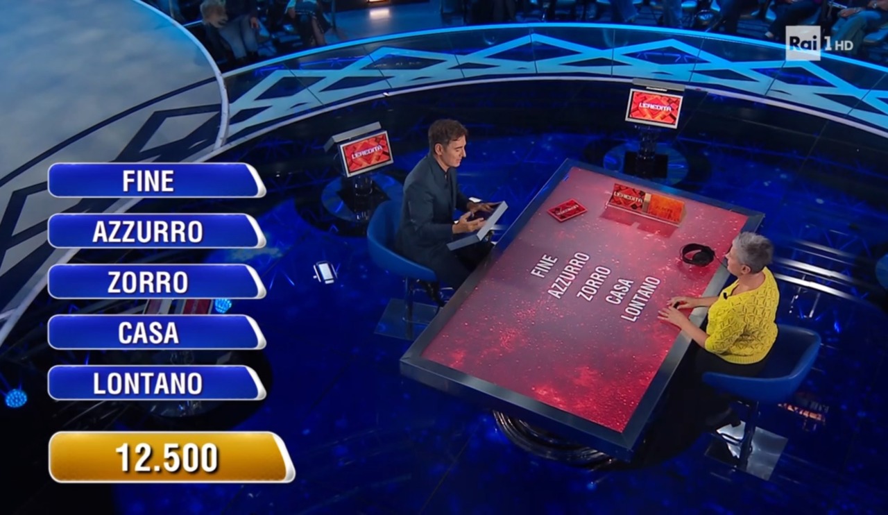 Le cinque parole da collegare erano: fine, azzurro, zorro, casa, lontano. Il montepremi iniziale di 200mila euro è stato dimezzato progressivamente fino a 12.500 euro. Simona ha scelto “Albero” come parola da abbinare, ma quella corretta era “Sogno”.