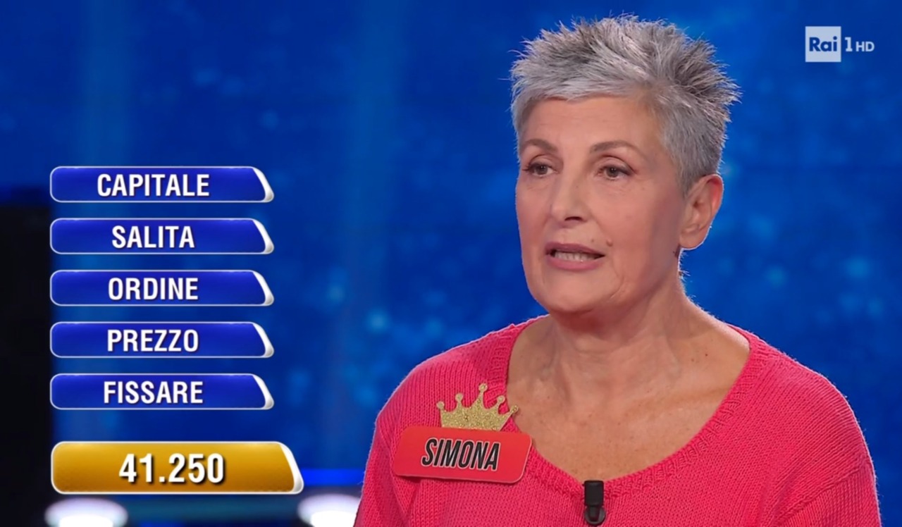Infine, con gli indizi: capitale, salita, ordine, prezzo, fissare, ha deciso di collegare la parola “Partenza”. Inaspettatamente, ogni singolo collegamento si è rivelato corretto, confermando la parola da lei scritta come quella vincente e permettendole di aggiudicarsi il montepremi.